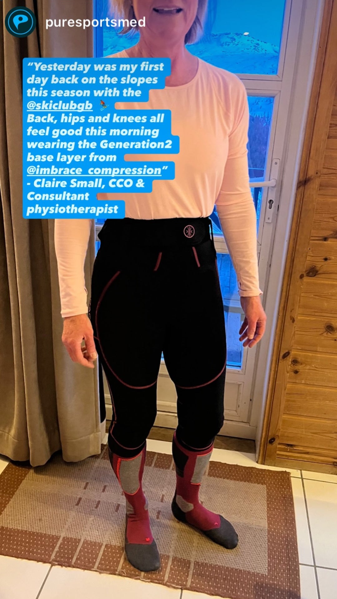 The Imbrace ski leggings give a light support that gives me confidence. Prior to my knee op I had been using braces, but with Imbrace I find I no longer need them.